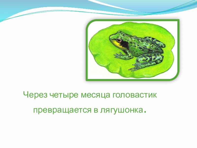 Слайд 10Через четыре месяца головастик превращается в лягушонка.