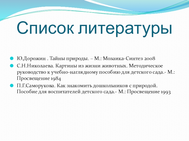 Список литературыЮ.Дорожин . Тайны природы. – М.: Мозаика-Синтез 2008С.Н.Николаева. Картины из жизни животных. Методическое руководство к учебно-наглядному