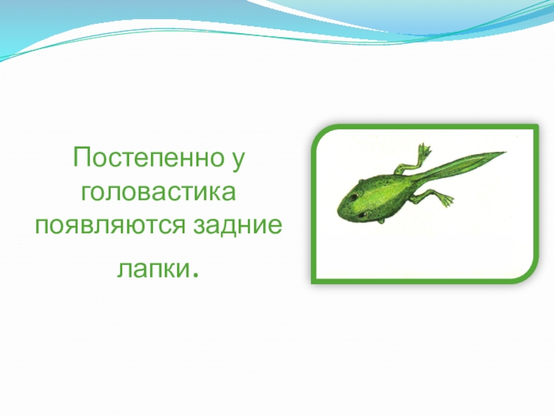 Слайд 7Постепенно у головастика появляются задние лапки.