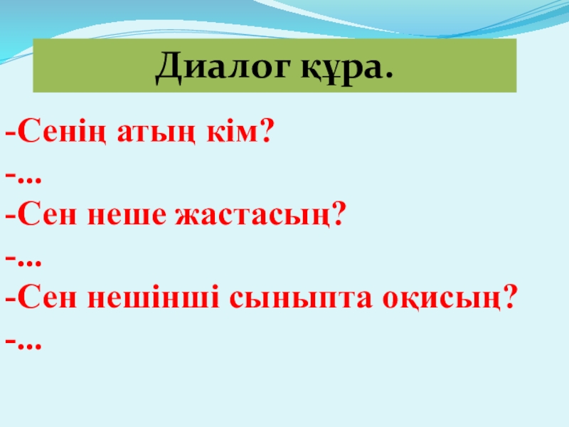 Диалог құра. Сенің атың кім?...Сен неше жастасың?...Сен нешінші сыныпта оқисың?...