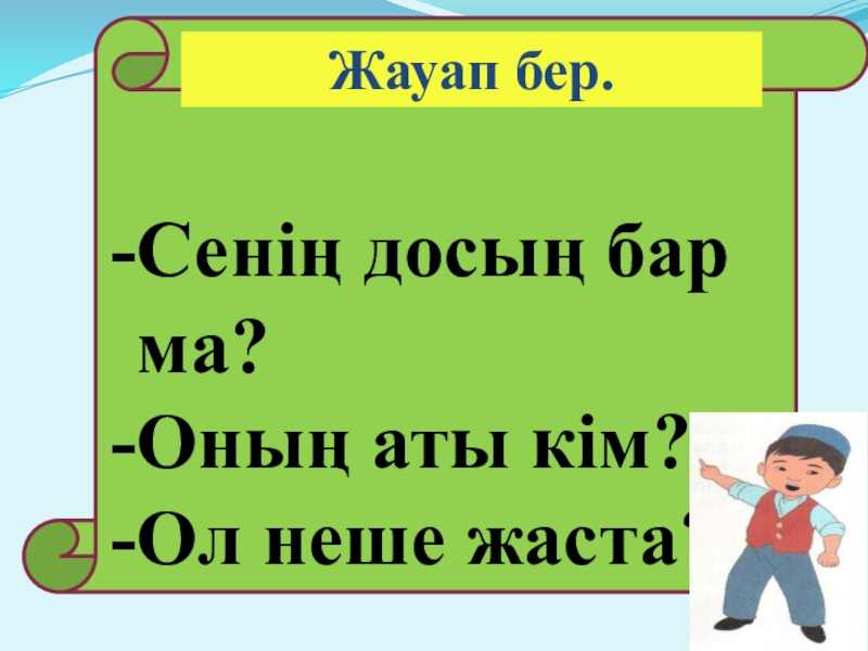 Сенің досың бар ма?Оның аты кім?Ол неше жаста? Жауап бер.