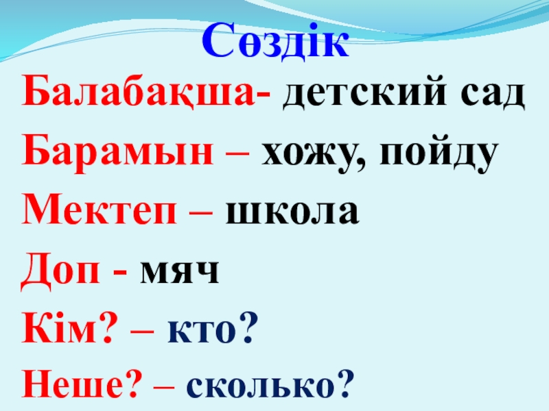 СөздікБалабақша- детский садБарамын – хожу, пойдуМектеп – школаДоп - мячКім? – кто?Неше? – сколько?