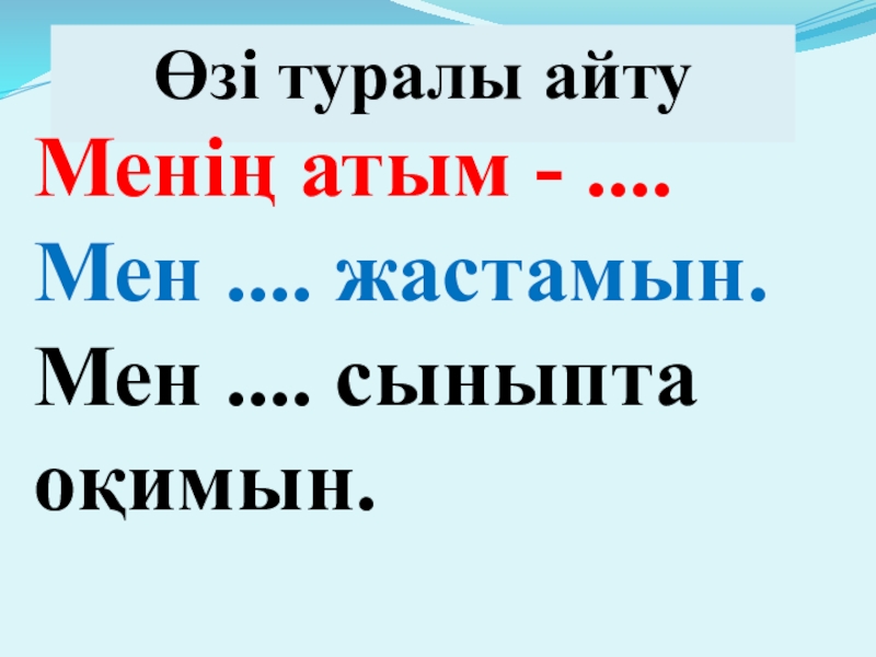 Өзі туралы айтуМенің атым - ....Мен .... жастамын.Мен .... сыныпта оқимын.