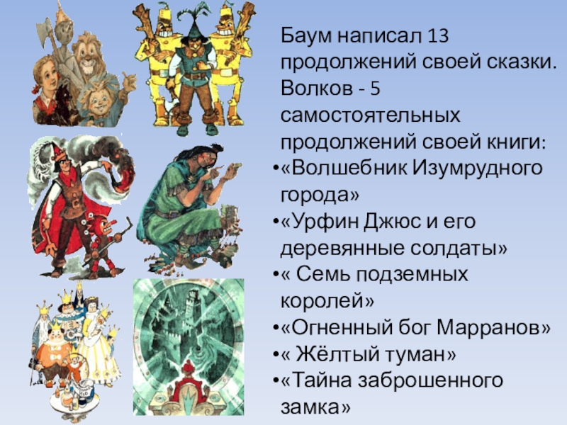 Баум написал 13 продолжений своей сказки. Волков - 5 самостоятельных продолжений своей книги:«Волшебник Изумрудного города»«Урфин Джюс и