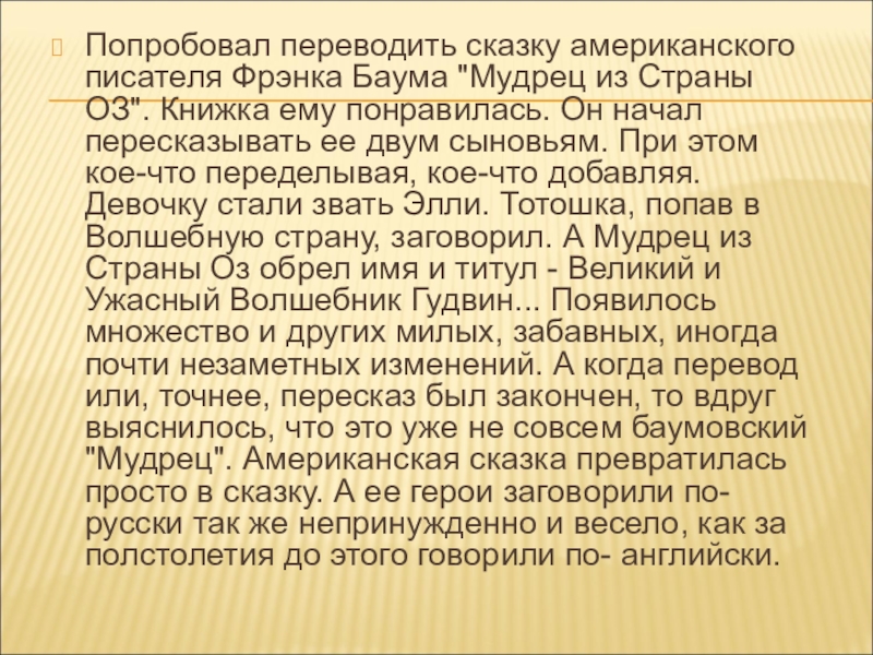 Слайд 6Попробовал переводить сказку американского писателя Фрэнка Баума "Мудрец из Страны ОЗ".