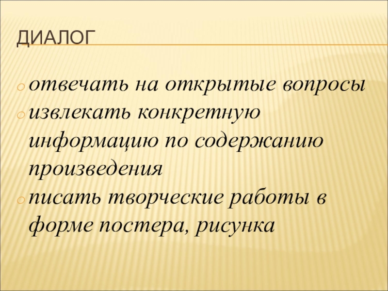 ДИАЛОГотвечать на открытые вопросыизвлекать конкретную информацию по содержанию произведения писать творческие работы в форме постера, рисунка