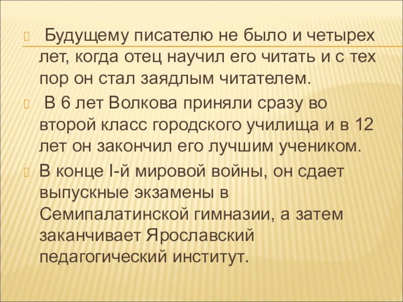 В 6 лет Волкова приняли сразу во второй класс городского училища и в 12 лет он закончил его лучшим учеником.