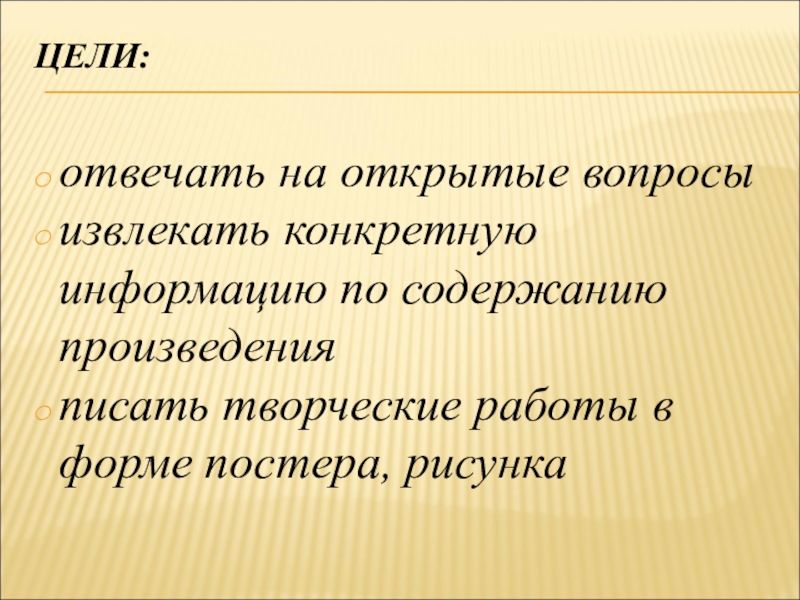 ЦЕЛИ: отвечать на открытые вопросыизвлекать конкретную информацию по содержанию произведения писать творческие работы в форме постера, рисунка