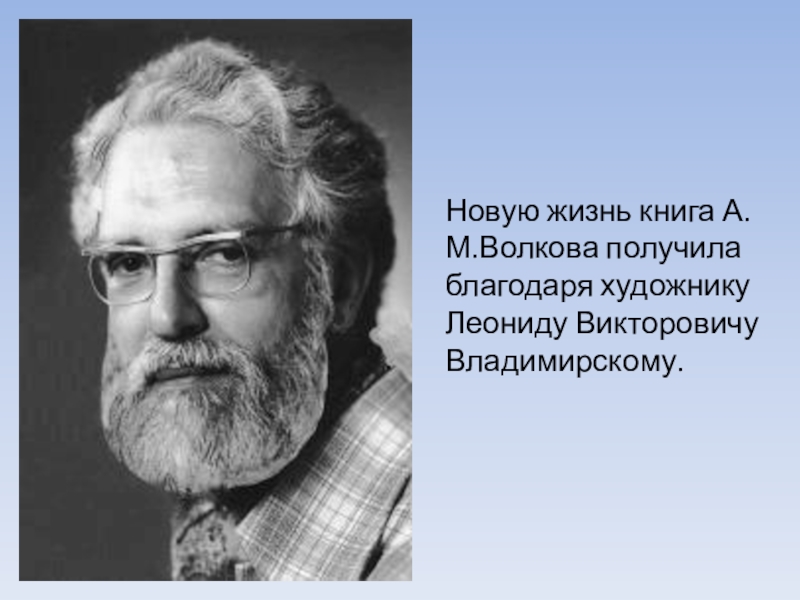 Слайд 8Новую жизнь книга А.М.Волкова получила благодаря художнику Леониду Викторовичу Владимирскому.
