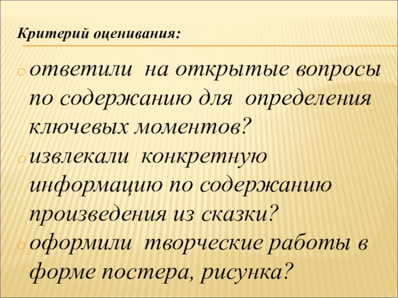 Критерий оценивания:  ответили на открытые вопросы по содержанию для определения ключевых моментов?извлекали конкретную информацию по содержанию