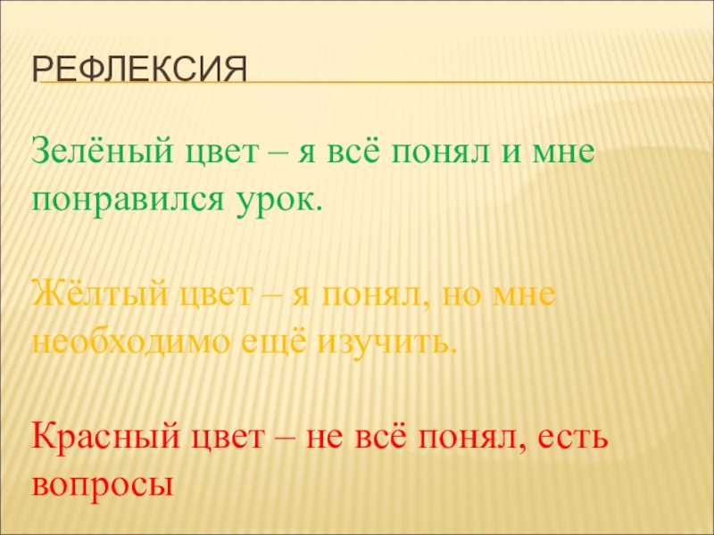 РЕФЛЕКСИЯЗелёный цвет – я всё понял и мне понравился урок.Жёлтый цвет – я понял, но мне необходимо