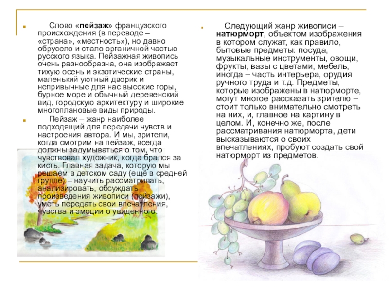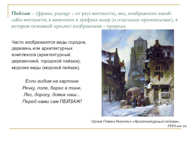 Пейзаж – (франц. paysage – от pays местность), вид, изображение какой-либо местности; в живописи и графике жанр (и отдельное произведение), в котором основной предмет изображения – природа.
