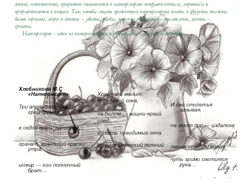 Следующий жанр живописи – натюрморт, объектом изображения в котором служат, как правило, бытовые предметы: посуда, музыкальные инструменты, овощи, фрукты, вазы с цветами, мебель, иногда – часть интерьера, орудия ручного труда и т.д. Предметы, которые изображены в натюрморте, могут многое рассказать зрителю – стоит только внимательно смотреть на них, и, главное на картину в целом. И, конечно же, после рассматривания натюрморта, дети высказываются о своих впечатлениях, пробуют создать свой натюрморт из предметов.