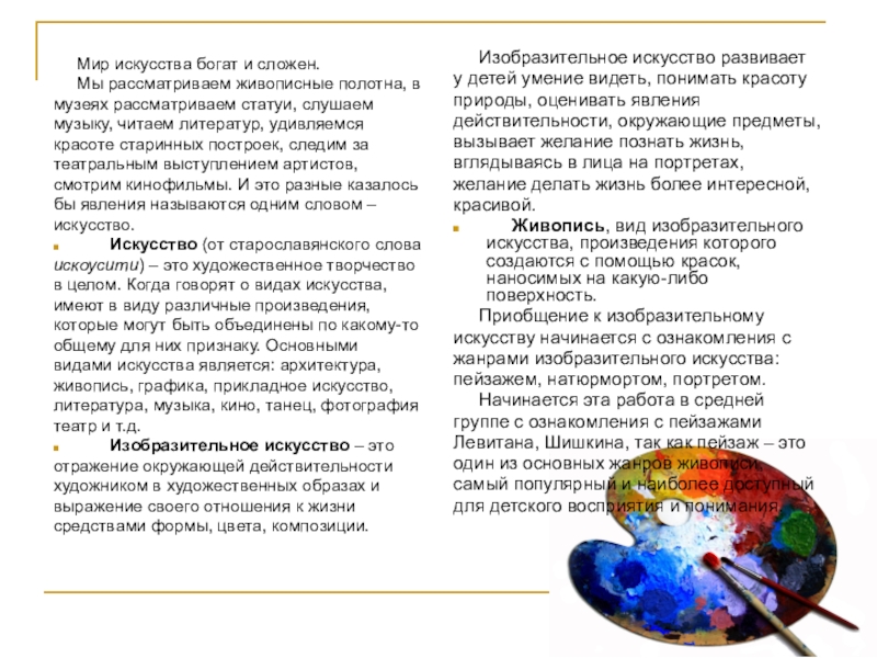 Живопись, вид изобразительного искусства, произведения которого создаются с помощью красок, наносимых на какую-либо поверхность.