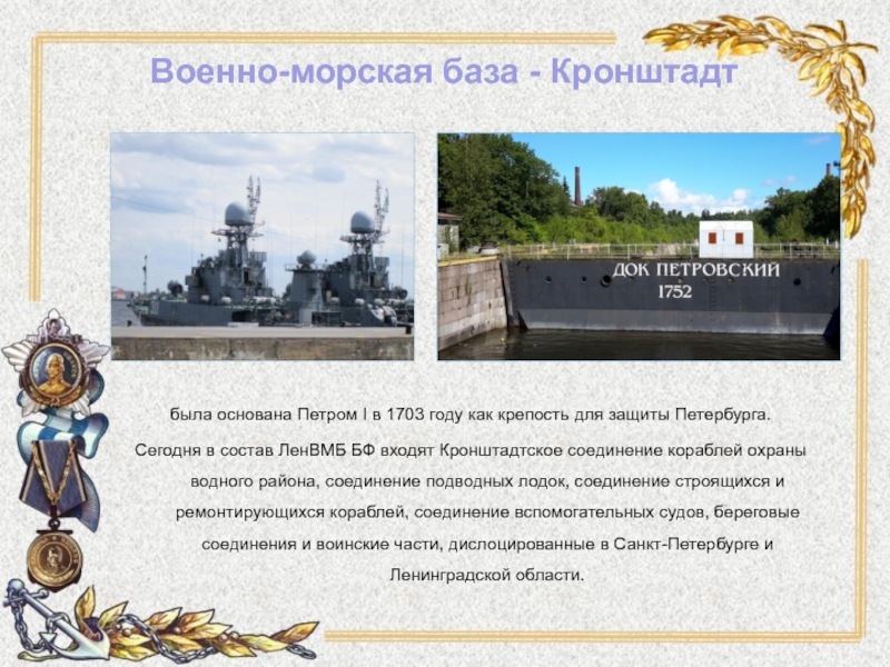 Сегодня в состав ЛенВМБ БФ входят Кронштадтское соединение кораблей охраны водного района, соединение подводных лодок, соединение строящихся и ремонтирующихся кораблей, соединение вспомогательных судов, береговые соединения и воинские части, дислоцированные в Санкт-Петербурге и Ленинградской области.