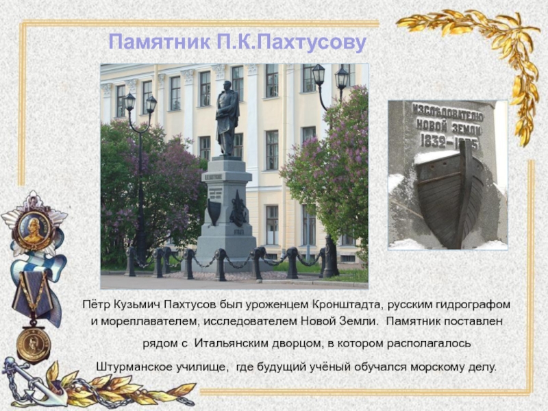 исследователем Новой Земли. Памятник поставлен рядом с Итальянским дворцом, в котором располагалось