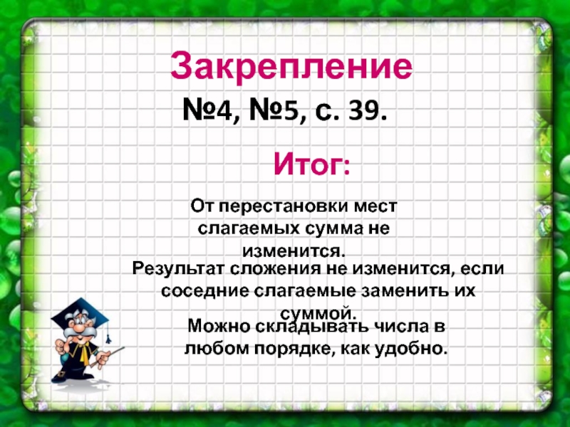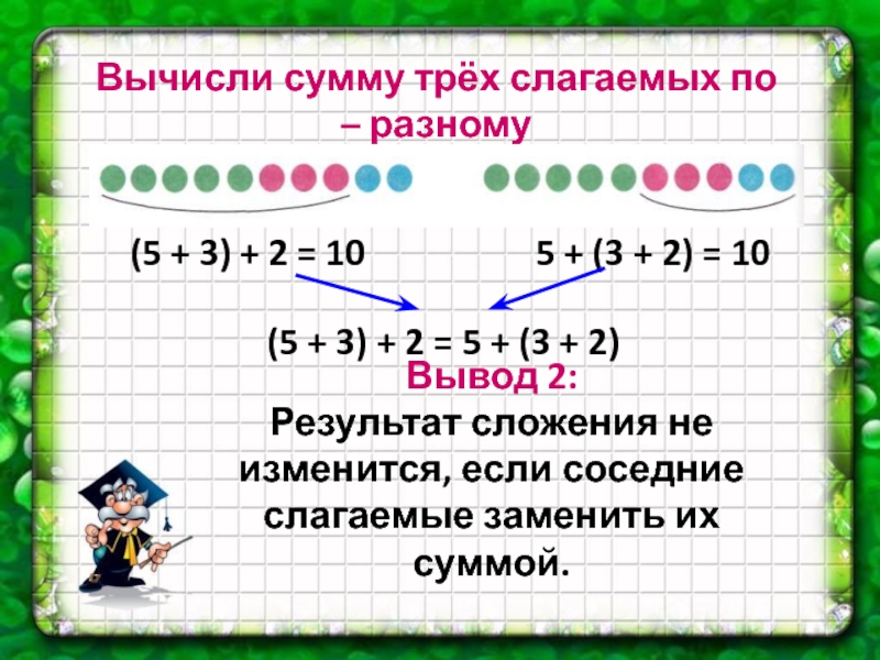 Результат сложения не изменится, если соседние слагаемые заменить их суммой.