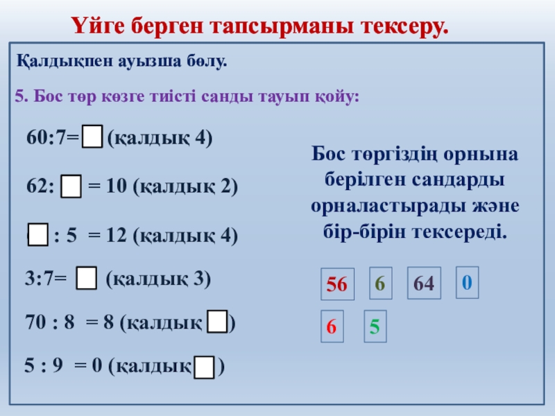 Бос төргіздің орнына берілген сандарды орналастырады және бір-бірін тексереді.