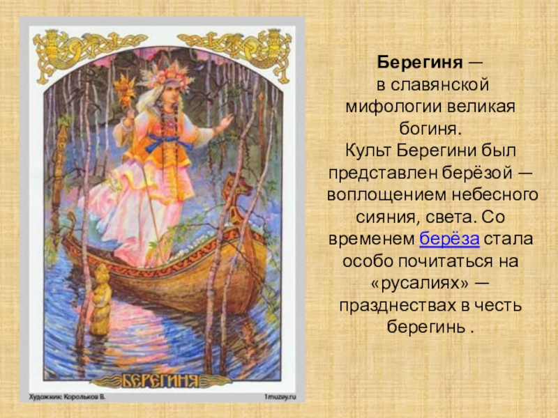 воплощением небесного сияния, света. Со временем берёза стала особо почитаться на «русалиях» — празднествах в честь берегинь .