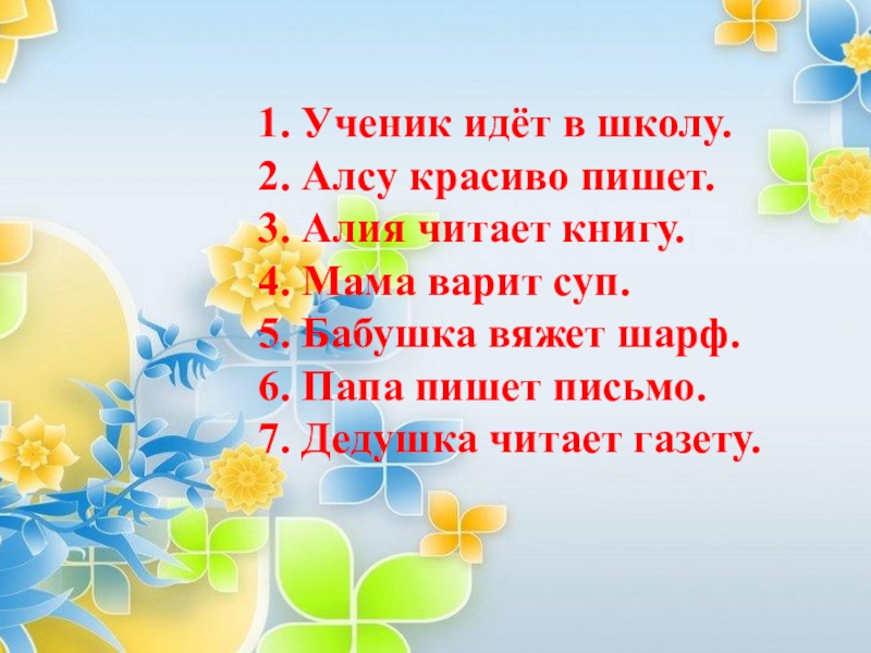 Алсу красиво пишет. 3. Алия читает книгу. 4. Мама варит суп. 5. Бабушка вяжет шарф. 6. Папа пишет письмо. 7. Дедушка читает газету.