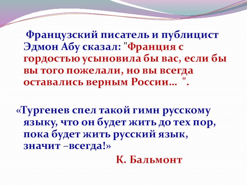 «Тургенев спел такой гимн русскому языку, что он будет жить до тех пор, пока будет жить русский язык, значит –всегда!»