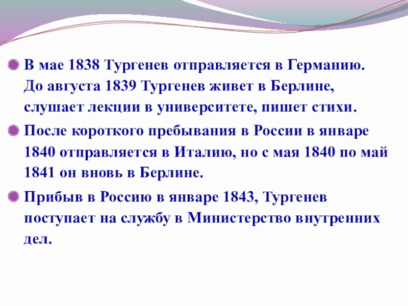 В мае 1838 Тургенев отправляется в Германию. До августа 1839 Тургенев