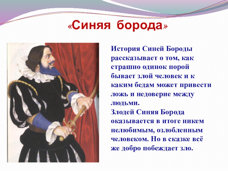 Злодей Синяя Борода оказывается в итоге никем нелюбимым, озлобленным человеком. Но в сказке всё же добро побеждает зло.