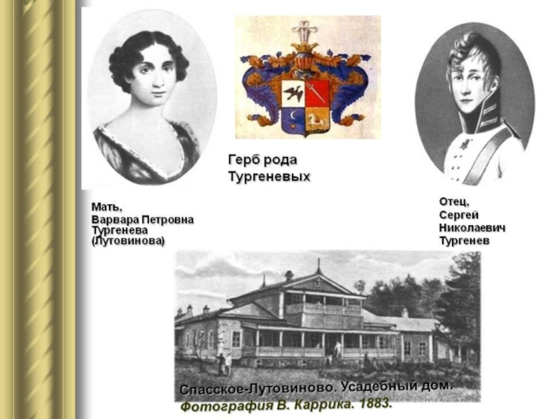 Мать, Варвара Петровна, урожденная Лутовинова, богатая помещица; в ее имении Спасское -Лутовиново ( Мценский уезд Орловской губернии) прошли детские годы будущего писателя.