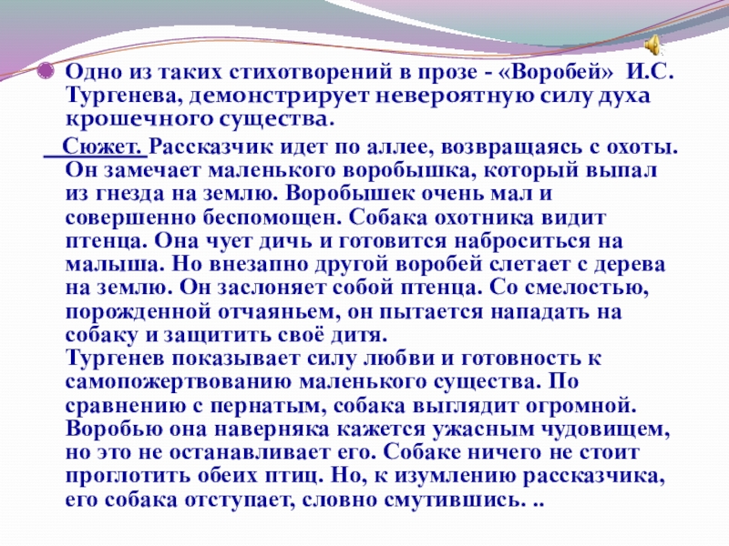Слайд 23Одно из таких стихотворений в прозе - «Воробей» И.С.Тургенева, демонстрирует невероятную