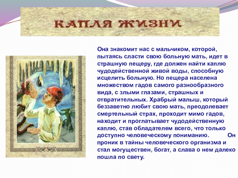 мать, идет в страшную пещеру, где должен найти каплю чудодейственной живой воды, способную исцелить больную. Но пещера населена множеством гадов самого разнообразного вида, с злыми глазами, страшных и отвратительных. Храбрый малыш, который беззаветно любит свою мать, преодолевает смертельный страх, проходит мимо гадов, находит и проглатывает чудодейственную каплю, став обладателем всего, что только доступно человеческому пониманию. Он проник в тайны человеческого организма и стал могуществен, богат, а слава о нем далеко пошла по свету.