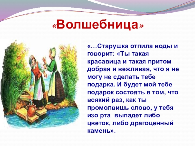 добрая и вежливая, что я не могу не сделать тебе подарка. И будет мой тебе подарок состоять в том, что всякий раз, как ты промолвишь слово, у тебя изо рта выпадет либо цветок, либо драгоценный камень».