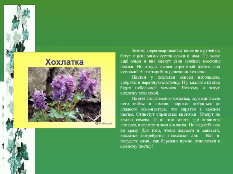 Цветёт подснежник-хохлатка, жужжат возле него пчёлы и шмели, норовят добраться до сладкого сока-нектара, что спрятан в каждом цветке. Отцветут сиреневые цветочки. Упадут на землю семена. И на том месте, где останется семечко, вырастет новая хохлатка. Но зацветёт она не сразу. Для того, чтобы вырасти и зацвести, хохлатке потребуется несколько лет. Вот и посудите сами, как бережно нужно относиться к каждому цветку!