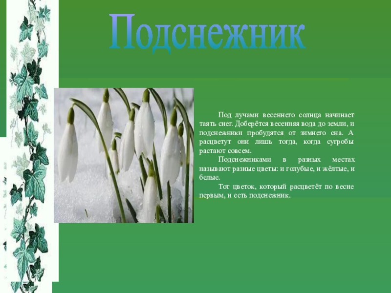 земли, и подснежники пробудятся от зимнего сна. А расцветут они лишь тогда, когда сугробы растают совсем.