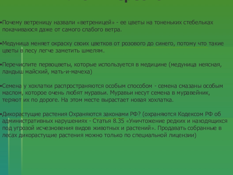 Дикорастущие растения Охраняются законами РФ? (охраняются Кодексом РФ об административных нарушениях - Статья 8.35 «Уничтожение редких и находящихся под угрозой исчезновения видов животных и растений». Продавать собранные в лесах дикорастущие растения можно только по специальной лицензии)