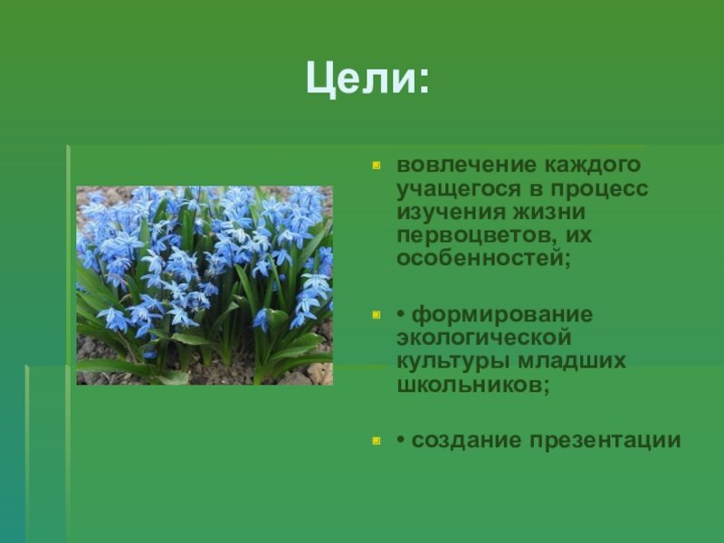 вовлечение каждого учащегося в процесс изучения жизни первоцветов, их особенностей;