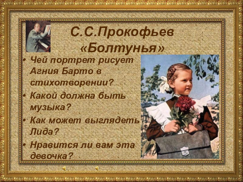 С.С.Прокофьев «Болтунья»Чей портрет рисует Агния Барто в стихотворении?Какой должна быть музыка?Как может выглядеть Лида?Нравится ли вам эта