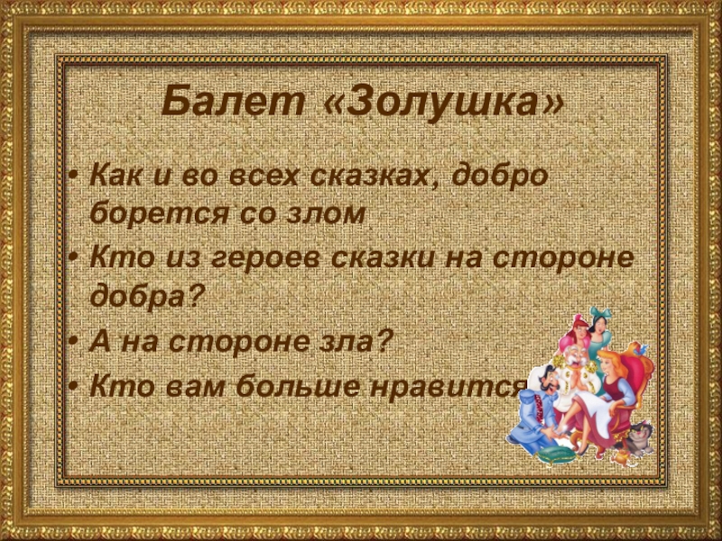 Балет «Золушка»Как и во всех сказках, добро борется со зломКто из героев сказки на стороне добра?А на