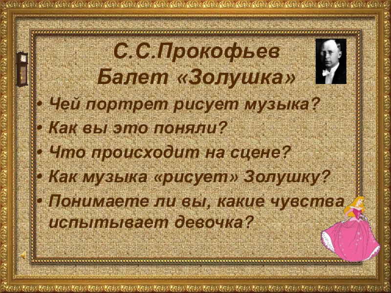 С.С.Прокофьев Балет «Золушка»Чей портрет рисует музыка?Как вы это поняли? Что происходит на сцене?Как музыка «рисует» Золушку?Понимаете ли