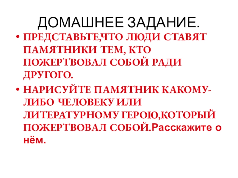 ДОМАШНЕЕ ЗАДАНИЕ. ПРЕДСТАВЬТЕ,ЧТО ЛЮДИ СТАВЯТ ПАМЯТНИКИ ТЕМ, КТО ПОЖЕРТВОВАЛ СОБОЙ РАДИ ДРУГОГО.НАРИСУЙТЕ ПАМЯТНИК КАКОМУ-ЛИБО ЧЕЛОВЕКУ ИЛИ ЛИТЕРАТУРНОМУ