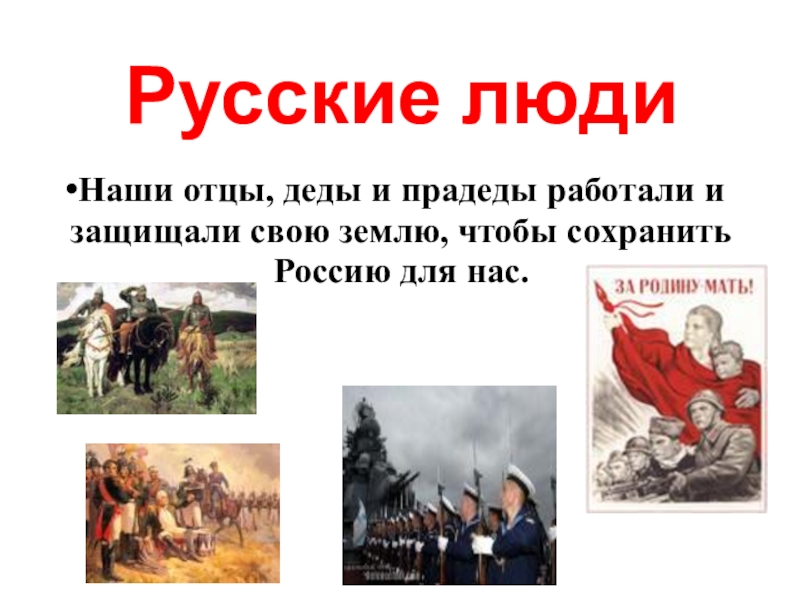 Русские людиНаши отцы, деды и прадеды работали и защищали свою землю, чтобы сохранить Россию для нас.