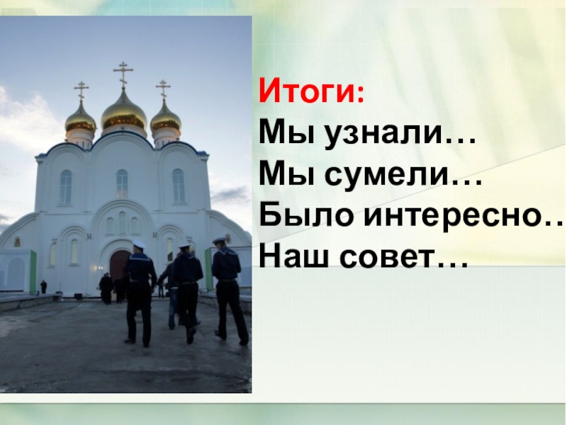 Итоги:Мы узнали… Мы сумели…Было интересно…Наш совет…