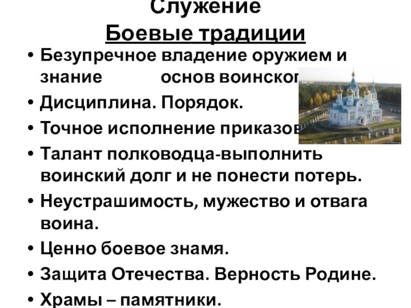 Служение  Боевые традиции Безупречное владение оружием и знание       основ воинского