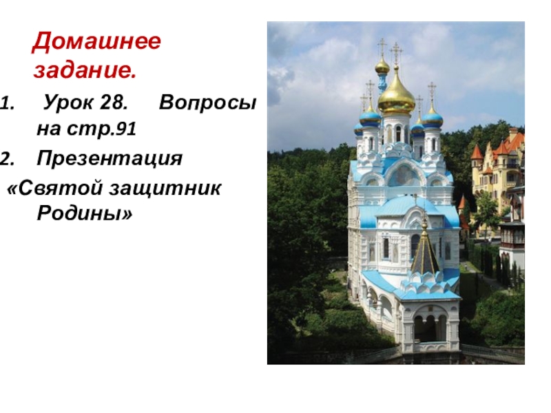 Домашнее задание. Урок 28.   Вопросы на стр.91Презентация «Святой защитник Родины»