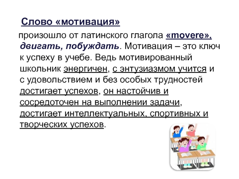 двигать, побуждать. Мотивация – это ключ к успеху в учебе. Ведь мотивированный школьник энергичен, с энтузиазмом учится и с удовольствием и без особых трудностей достигает успехов, он настойчив и сосредоточен на выполнении задачи, достигает интеллектуальных, спортивных и творческих успехов.