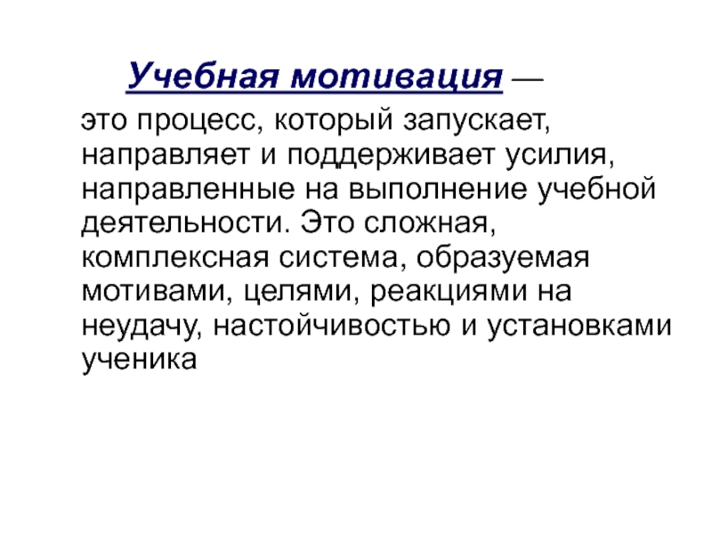 направляет и поддерживает усилия, направленные на выполнение учебной деятельности. Это сложная, комплексная система, образуемая мотивами, целями, реакциями на неудачу, настойчивостью и установками ученика