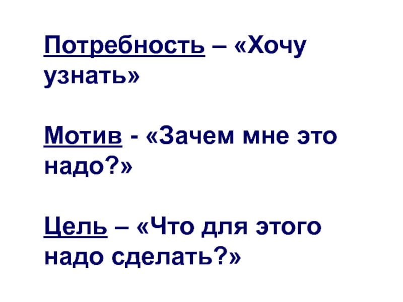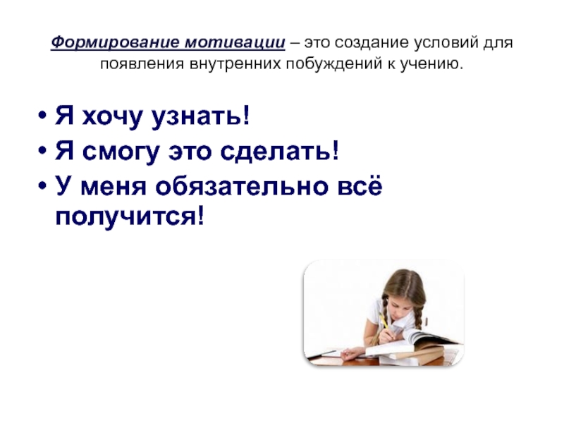 Слайд 7Формирование мотивации – это создание условий для появления внутренних побуждений к