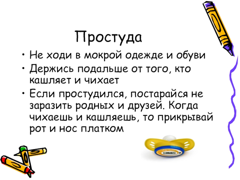 ПростудаНе ходи в мокрой одежде и обувиДержись подальше от того, кто кашляет и чихаетЕсли простудился, постарайся не
