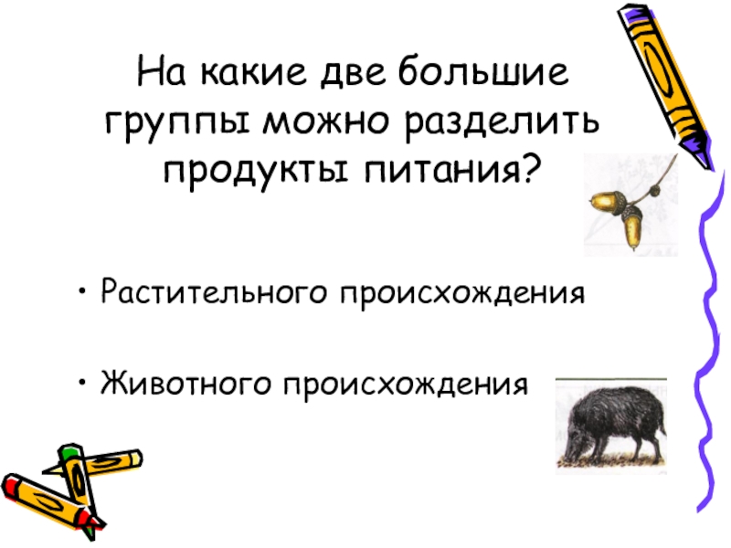 На какие две большие группы можно разделить продукты питания?Растительного происхожденияЖивотного происхождения
