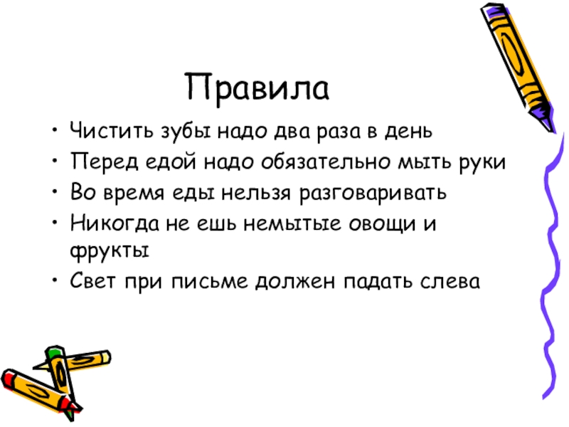 ПравилаЧистить зубы надо два раза в деньПеред едой надо обязательно мыть рукиВо время еды нельзя разговариватьНикогда не ешь немытые овощи и фруктыСвет при письме должен падать слева