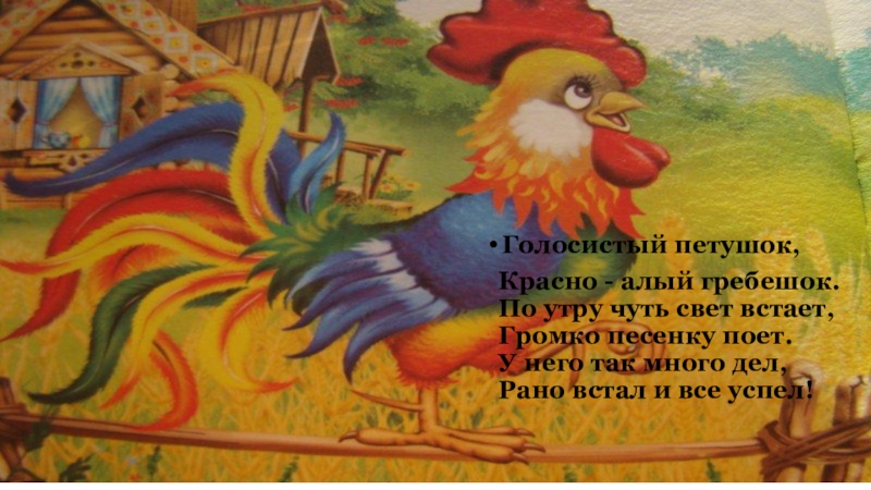 Голосистый петушок, Красно - алый гребешок.  По утру чуть свет встает,  Громко песенку поет.